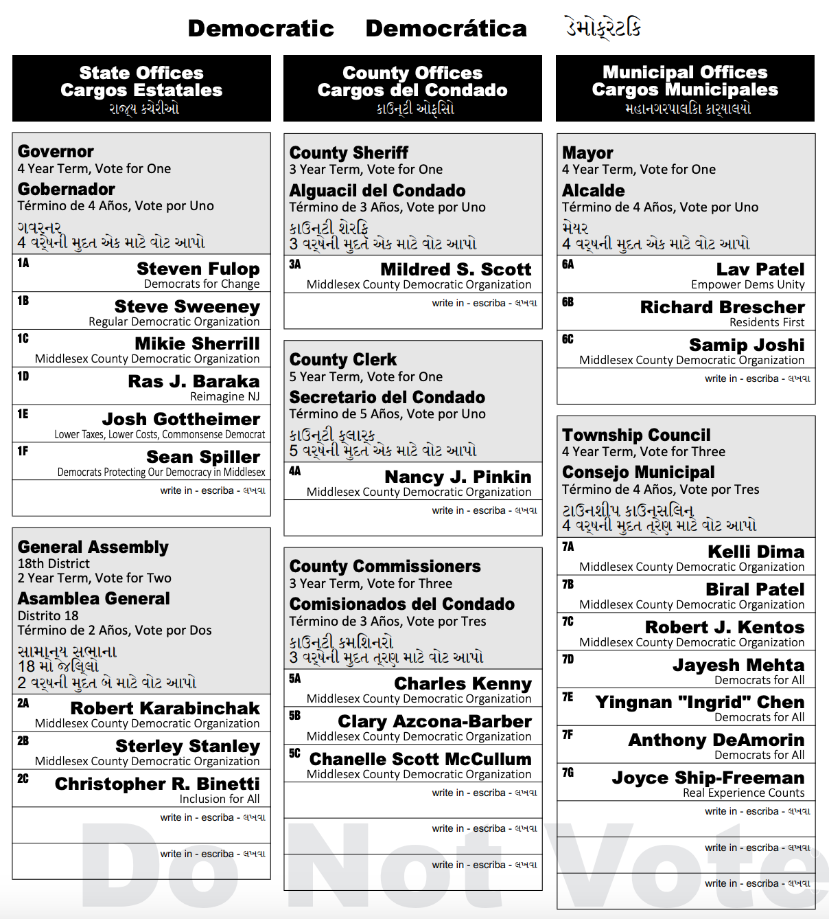 Edison is a large community of more than 100,000 in Central Jersey that is majority Asian, with three quarters of that being of South Asian origin. The community is at the center of a blockbuster primary to be the next mayor. Incumbent Sam Joshi and his slate of assembly candidates (Dima, Patel, and Kentos) face a strong challenge from Lav Patel and his own slate (Mehta, Chen, and DeAmorin). Patel is endorsed by and allied with Steven Fulop, while Joshi runs with the support of the official party leadership in Middlesex County. Patel is challenging Joshi on issues of public safety, fiscal discipline, and limiting cannabis businesses in the town. Recent brawls at a mall in Edison have become a key issue in this race. The yard sign warfare between the two campaigns is the most aggressive anywhere in the state. It is impossible to drive around Edison without spotting dozens of large signs on every major road.