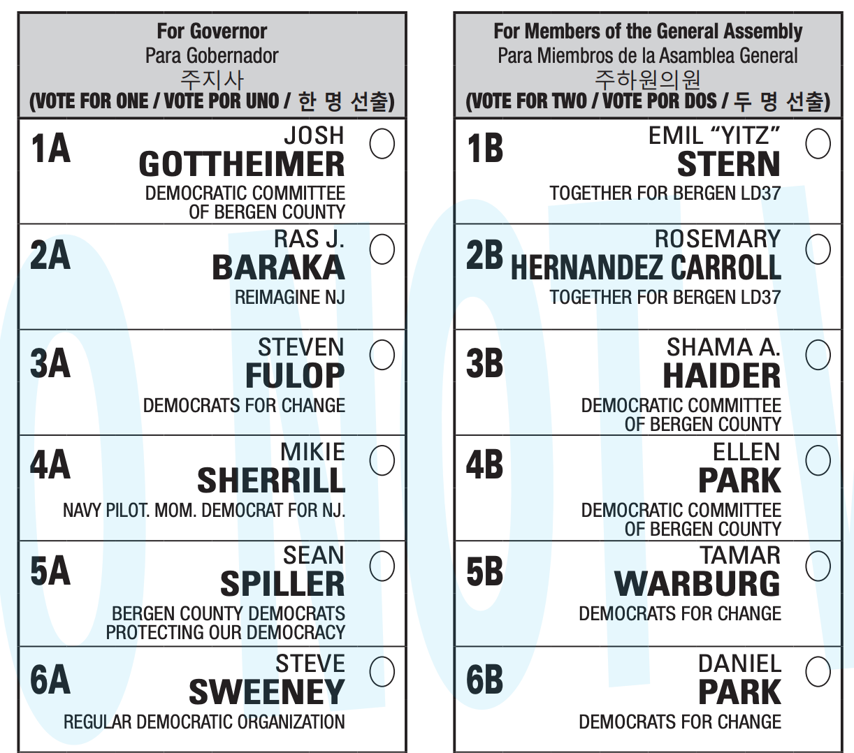 This legislative district includes Hackensack, Bogota, Ridgefield Park, Teaneck, Tenafly, Englewood, Englewood Cliffs, Fort Lee, Leonia, and Palisades Park. Incumbent Assemblywomen Ellen Park (D-Englewood Cliffs) and Shama Haider (D-Tenafly) have the backing of the Bergen County Democratic Party, which is also supporting Congressman Joshua Gottheimer in the gubernatorial primary. The two incumbents face challenges from two other slates.